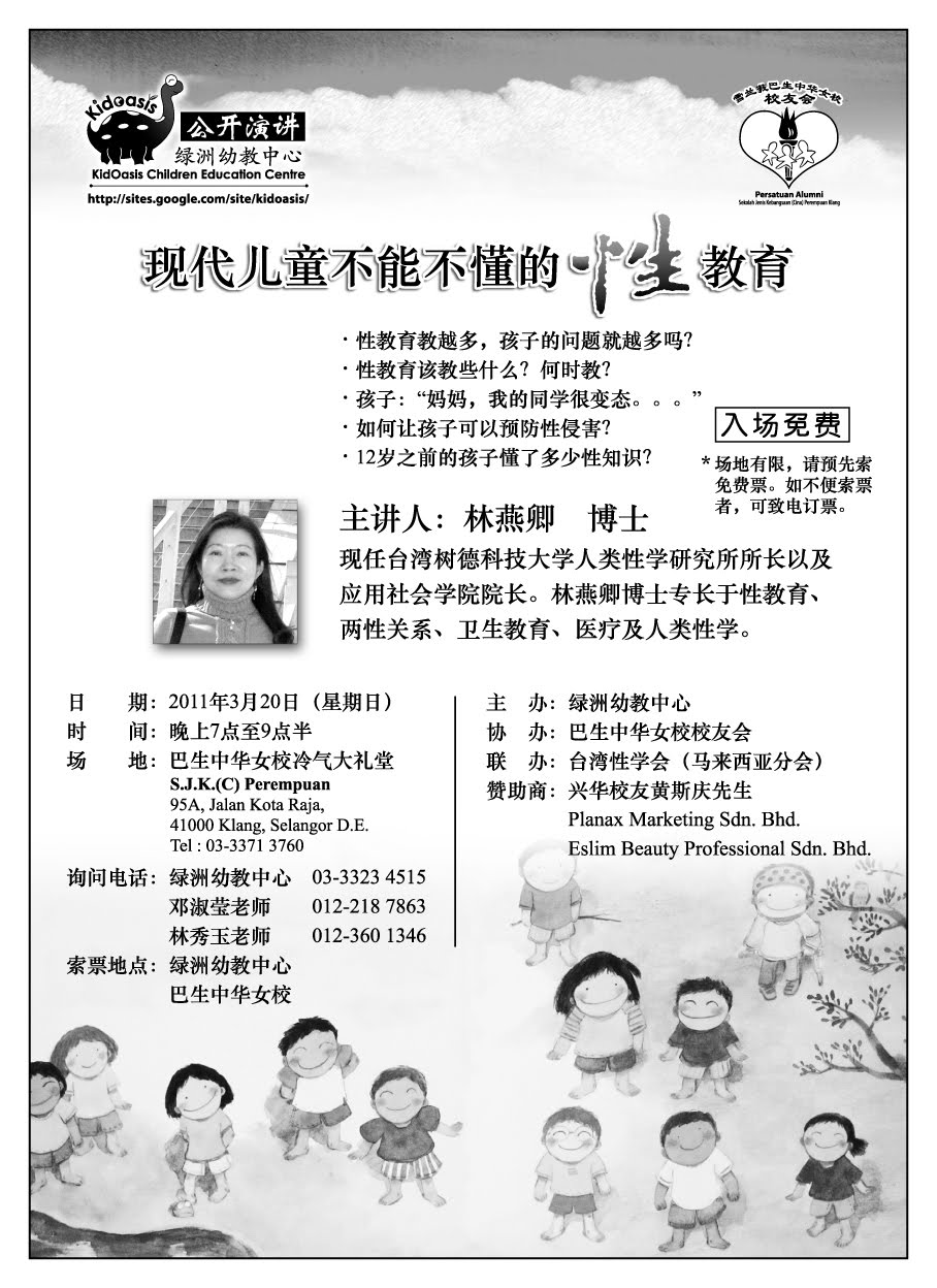 Previous Post20110320林燕卿教授“儿童不能不懂的性教育”演讲 Next Post 青少年的情欲世界 – 父母与教师性教育成长工作坊